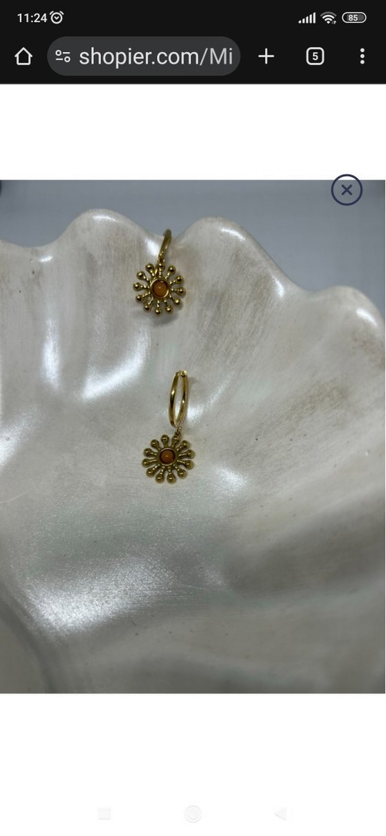 Parlak altın renkli, kısa boy boncuklu çiçek desenli küpeler, minimal bohem tarza uygundur.