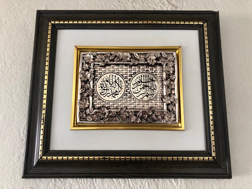Parlak altın renkli çerçeve içinde dini yazıların bulunduğu, detaylı çiçek desenli dokulu tablo. ✨
