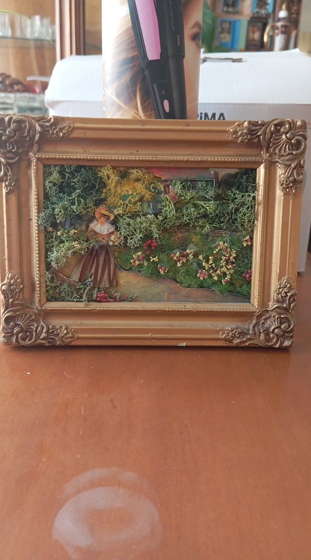 Altın renkli süslü çerçevede, doğa temalı koyu renkli bir tablo. Bahçede çiçekler ve yeşilliklerle çevrili bir figür yer alıyor.3boyutlu el emeği
