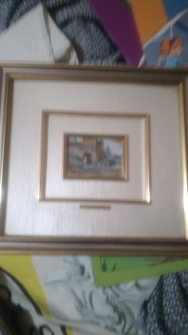 Altın renkli çerçevede, açık renk tonlarında küçük bir tablo. 925 ayar gümüş üzerine qltin kaplama roma tablo
