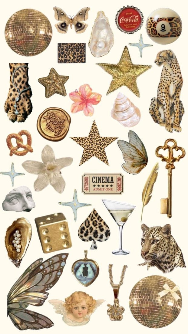 Yıldız, anahtar, çiçek, hayvan desenleri ve 'CINEMA ADMITON' bilet tasarımı gibi çeşitli altın renkli sticker süslemeleri. ✨