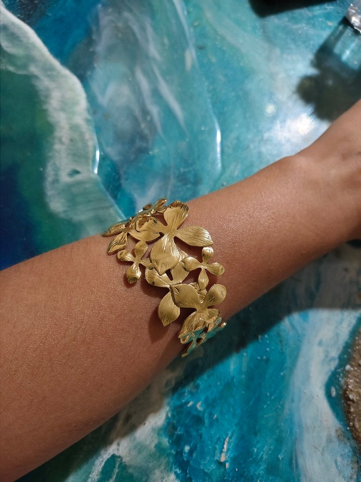 Parlak altın renkli bu bileklik, çiçek desenine sahip olup bohem ve gösterişli bir tarz sunar, düğünler için uygundur.