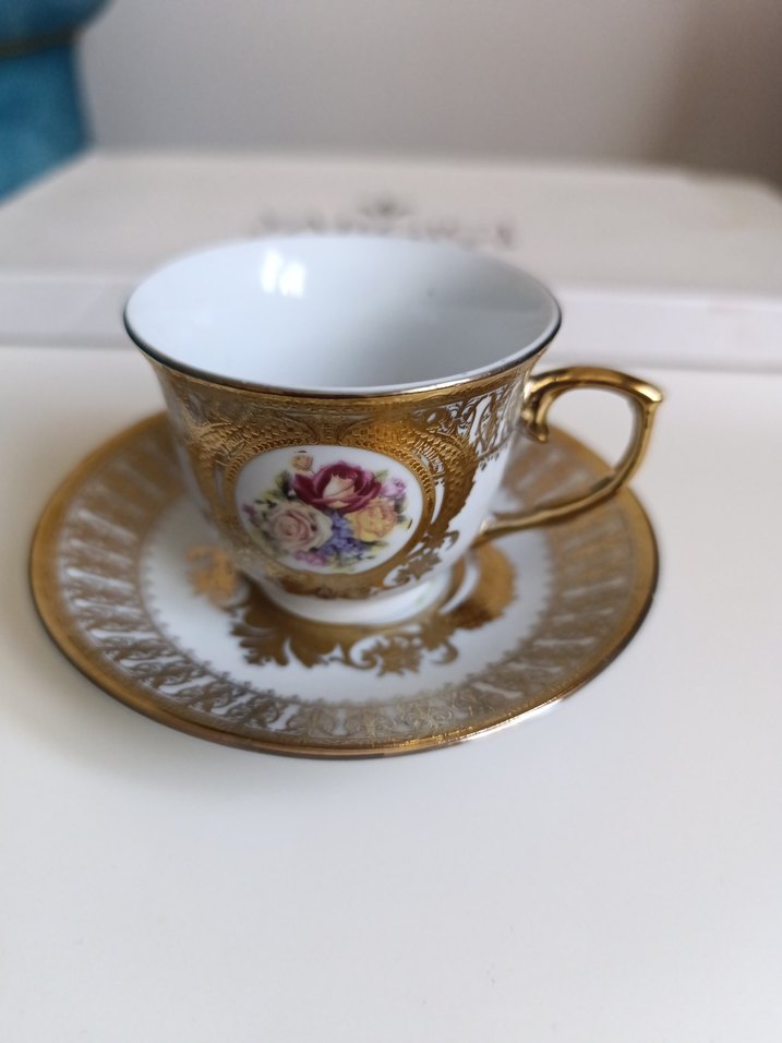 Parlak altın renkli, çiçek desenli fincan ve tabağı. İnce detaylı tasarıma sahip, içi beyaz ve sapı rahat tutuşlu.