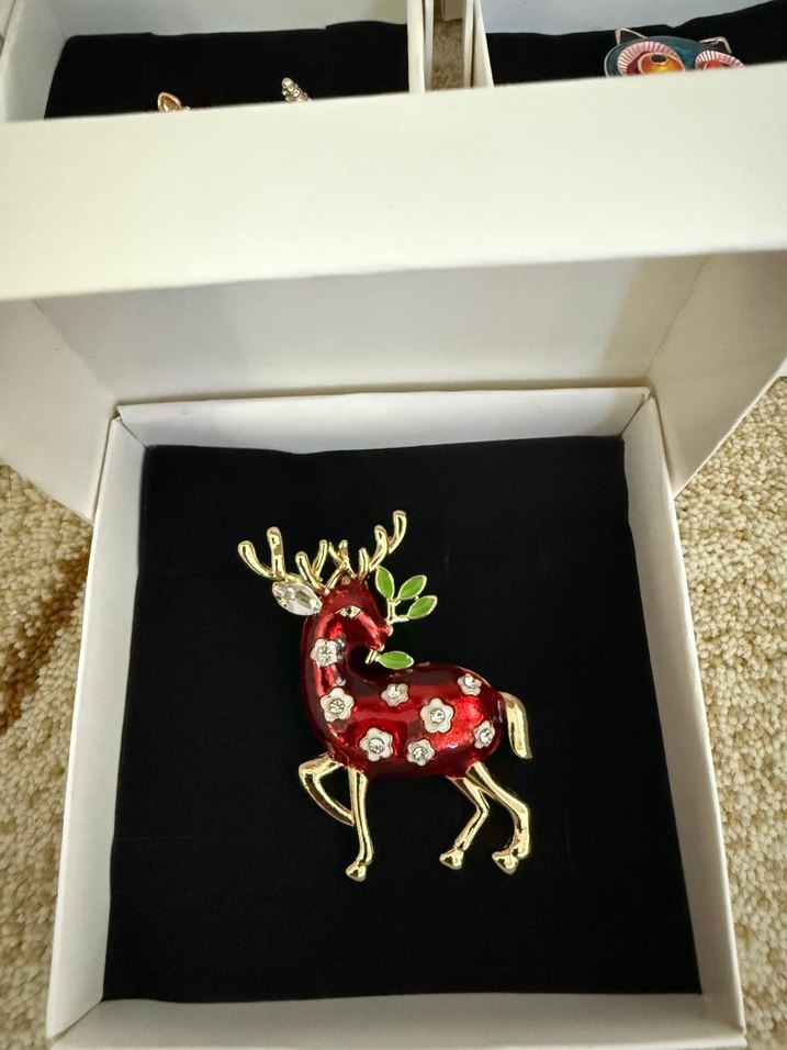 Altın renkli, pullu detaylara sahip çiçek desenli geyik broş, rahat ve bohem tarzda düğünler ve yeni yil konsepte uygundur.