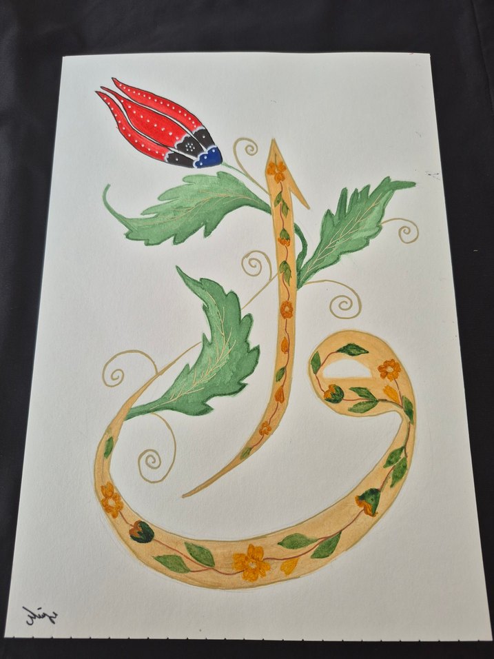 Altın renkli çiçek desenleriyle süslenmiş hat sanatı, yeşil yapraklar ve canlı kırmızı çiçek detayları içerir. Tezhip detaylı lale Akrilik /suluboya 21/30 boyutlarda 300 gr kağıt Kendi ürünüm ÇERÇEVESİZ gönderilecektir