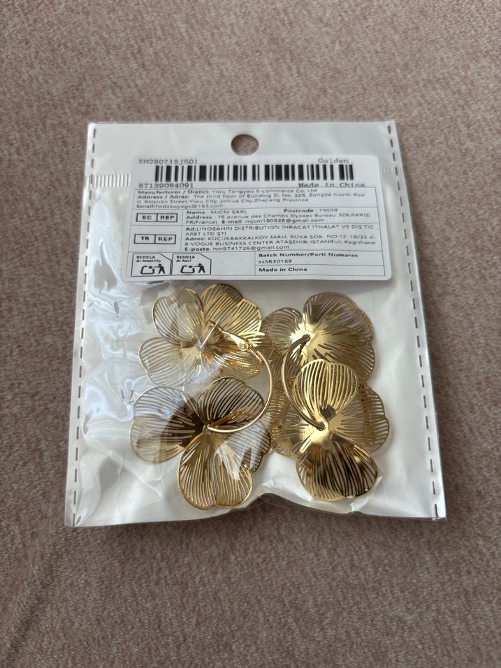 Hafif altın renkte, çiçek desenli ve payet detaylı midi küpeler, günlük kullanım için vintage bohem tarzını yansıtıyor.