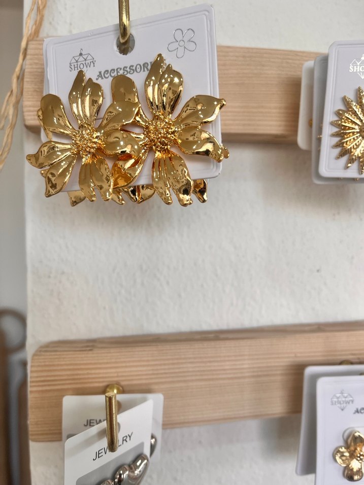 Parlak altın renkli, çiçek desenli, tokalı mini küpeler. Minimalist bohem tarzı ve düğünler için uygun.