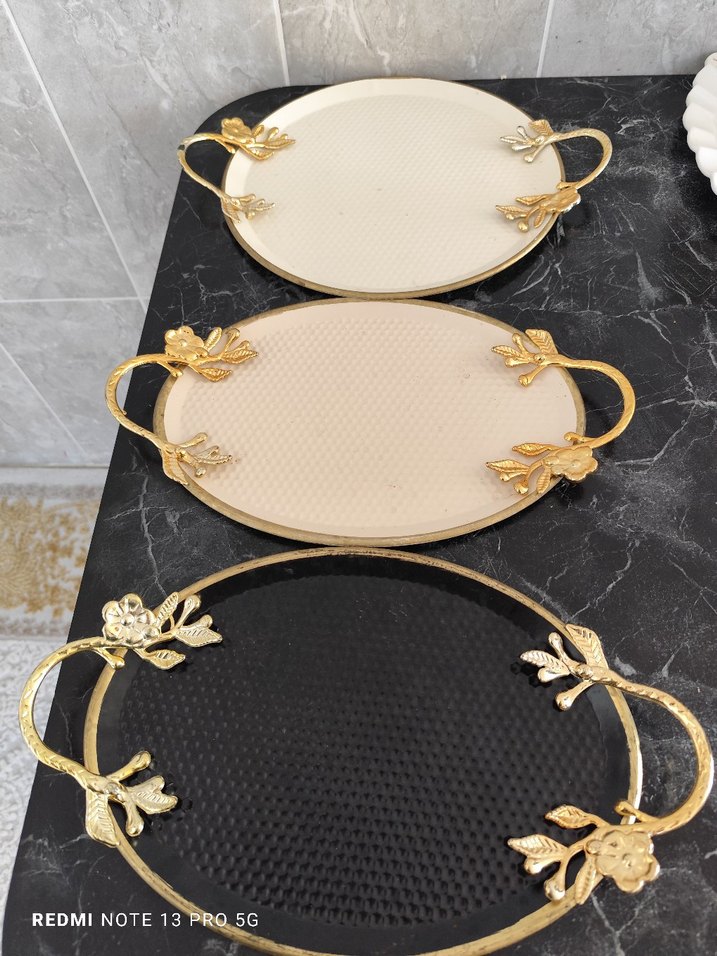 Parlak altın renkli, çiçek desenli saplara sahip modern klasik tarzda oval tepsiler. Servis veya sunum için uygundur. 3lü fiyattır.. Taşınma durumum olduğu için satıyorum.
