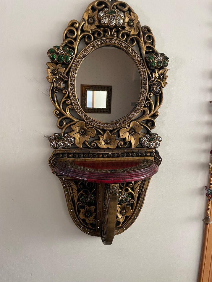Kervandan yıllar önce alınmıştır Yeşil ve kırmızı detaylı çiçek desenleriyle süslenmiş koyu altın renkli, vintage tarzda bir ayna.