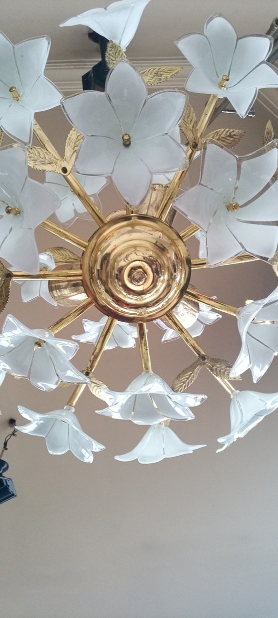 Altın kaplama ve buzlu cam çiçek detaylarıyla şık ve aydınlık bir tavan lambası. Hafif kararma var altın yerlerinde çok fazla belli olmuyor iki katlıdır 53 cm yarı çapındadır 54 cm boy