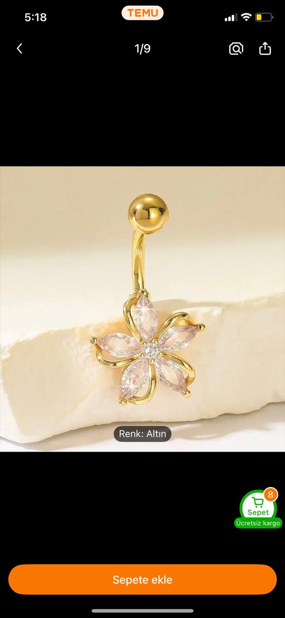Altın renkli, çiçek desenli ve boncuk detaylı göbek piercingi. Çelik değil atma yapacağını sanmıyorum