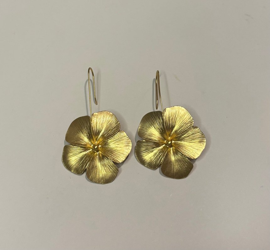 Bohem tarzda, altın renkli, sallantılı çiçek motifli midi uzunlukta minimalist küpeler. Romantik akşamlar için uygundur.