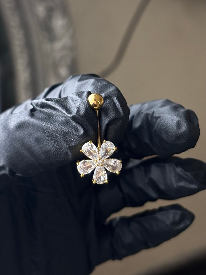 Altın renkli, parlak taşlarla süslenmiş çiçek tasarımlı göbek piercingi, cesur ve göz alıcı bir tarz için uygundur.