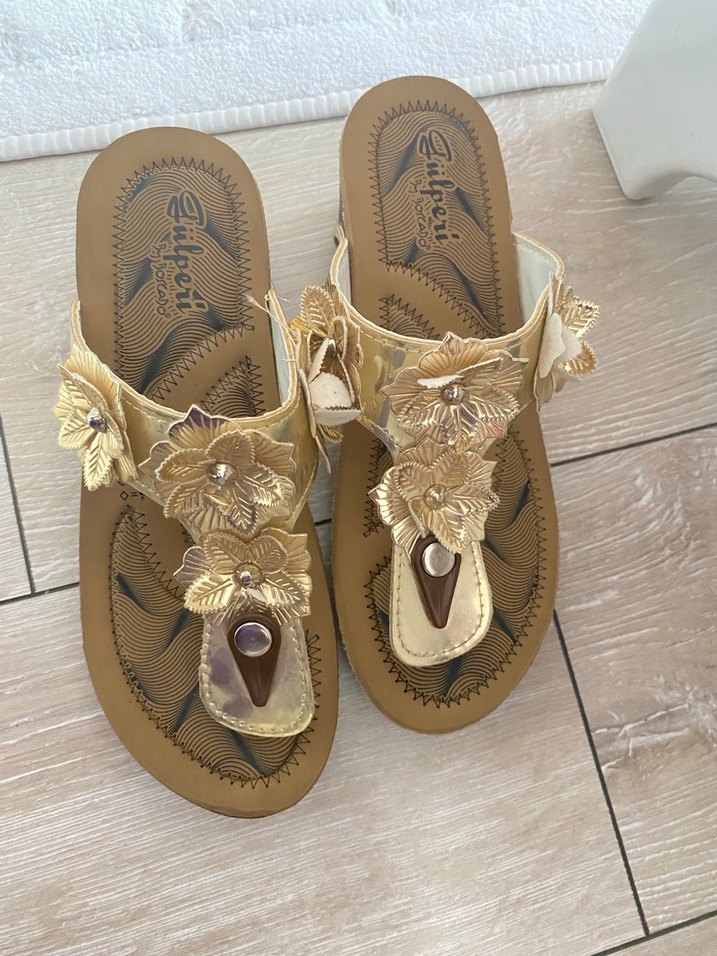 Altın renkli, çiçek detaylı, tokalı bantlı dolgu topuklu kadın sandalet. Günlük kullanıma uygun parlak yüzey ve kauçuk tabanlı.hiç kullanılmamıştır