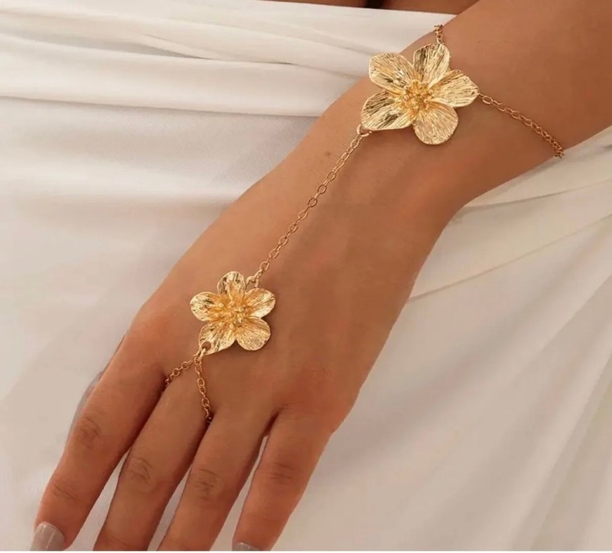Altın renkli, çiçek desenli ve boncuk detaylı kadın el zinciri, bohem düğünler için uygundur.