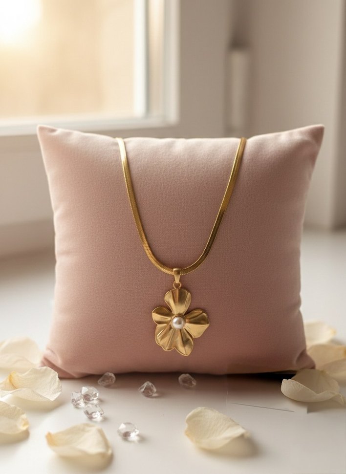 Altın renkli, inci detaylı çiçek figürlü, zincir detaylı ve midi uzunlukta günlük şıklık sunan kolye. inst: ada__taki