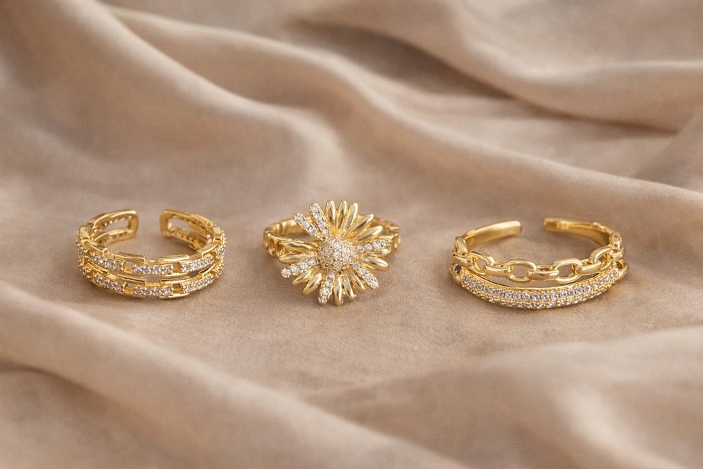 Altın renkli, çiçek desenli ve payet detaylı kadın yüzüğü. Bohem tarzı ve klasik zarafeti yansıtır, düğün için uygundur.
