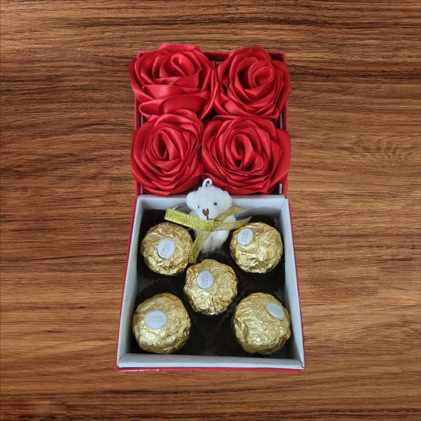 Küçük beyaz oyuncak ayı ile birlikte içinde Solmayan kırmızı güller ve altın renkli paketlenmiş çikolatalar bulunan hediye kutusu.