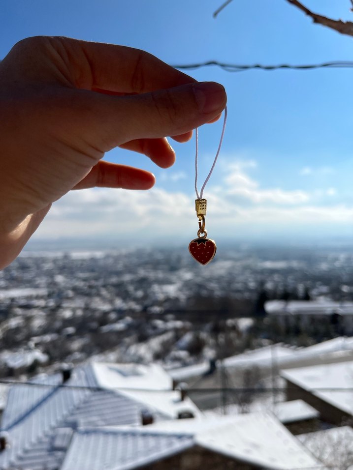 Parlak altın renginde, çilek kadın charm. Minimalist ve bohem tarzıyla günlük kullanıma uygun.