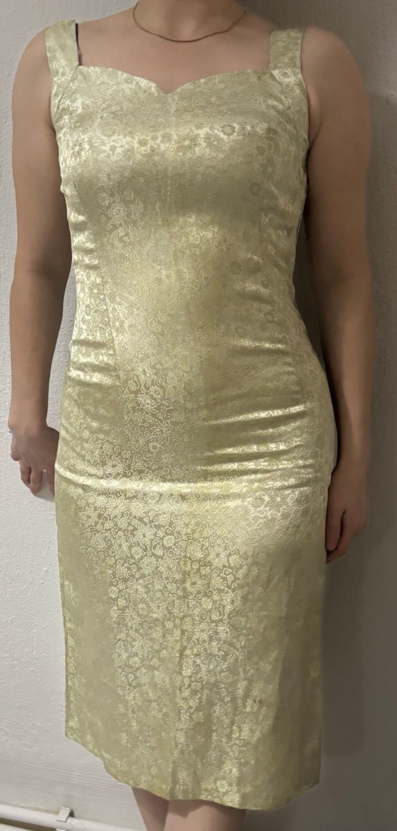 Altın renkli parlak dantel kumaştan,askılı ve kolsuz tasarıma sahip, klasik kesim midi abiye elbisedir. ✨