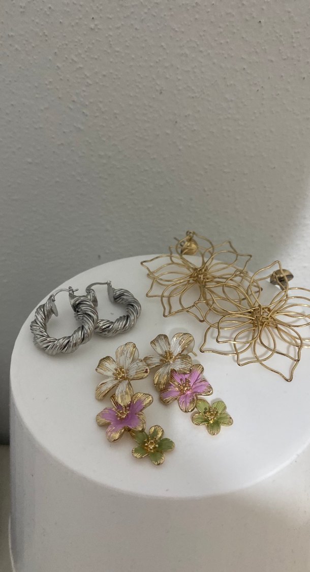 Altın renkli, dantel detaylı ve pastel çiçek desenli mini küpeler, bohem ve vintage tarzlar için uygun.