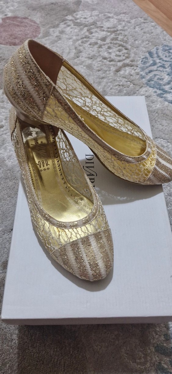 Altın renkli, dantel detaylı ve parlak yılan desenli yumurta topuklu kadın ayakkabısı. Kauçuk malzemeden üretilmiştir. Düğünler için uygundur. 39 numara.Hiç kullanılmadı