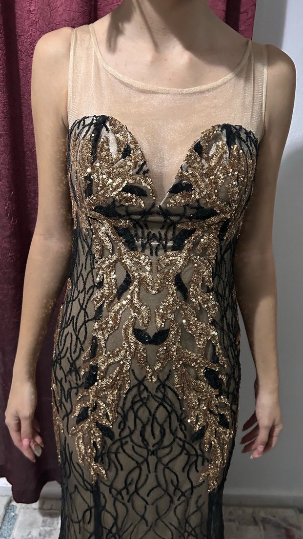 V yakalı, kolsuz ve vücuda oturan midi boy abiye elbise, şeffaf zeminde detaylı altın renkli dantel desenlere sahip. Cesur ve göz alıcı tarzda, parti için uygun. ✨ Boy:1.52 cm