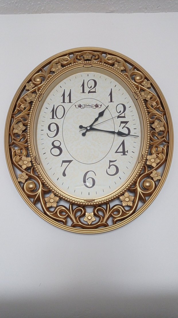 Altın renginde, çiçek detaylı dekoratif çerçeveli duvar saati. Siyah rakamlar açık zemin üzerinde yer alır. saat çalışır durumda