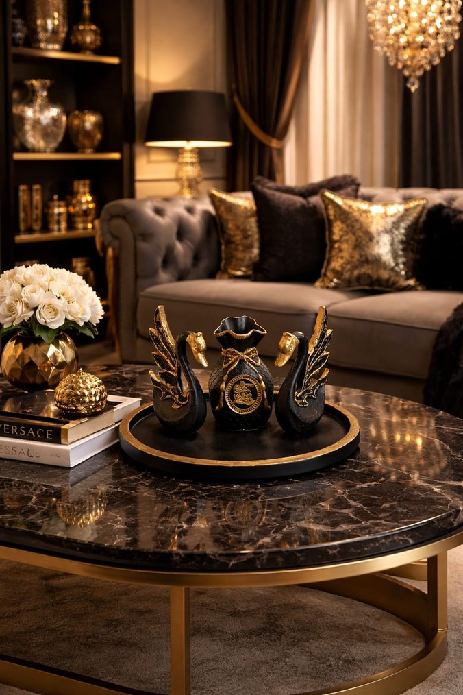 Yuvarlak siyah tepsi üzerinde koyu altın renkli kuğu figürleri ve merkezi vazo bulunan dekoratif set. Oturma odasına lüks bir dokunuş katıyor.