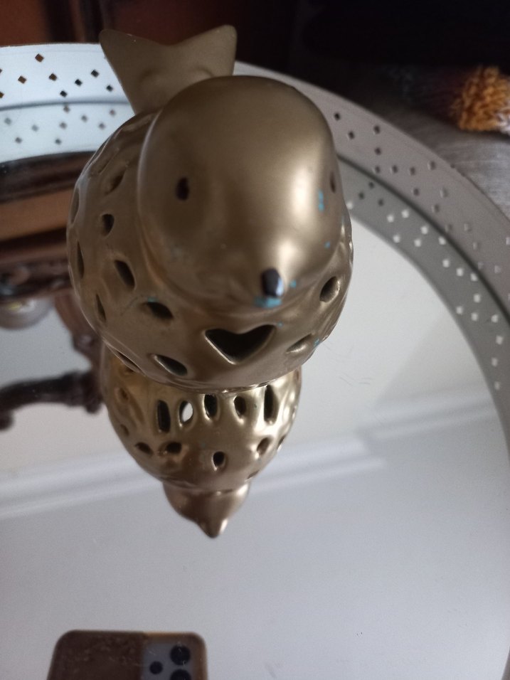 İnce kesim detaylara sahip altın renkli dekoratif kuş biblosu, mekâna zarafet katar.