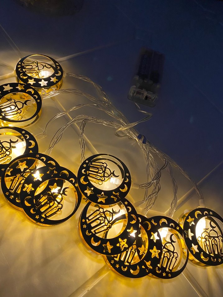 Yıldız ve ay desenli altın renkli dekoratif LED ışık zinciri, sıcak ve renkli bir ortam yaratır. Her mekana hoş bir ışık katar. ✨