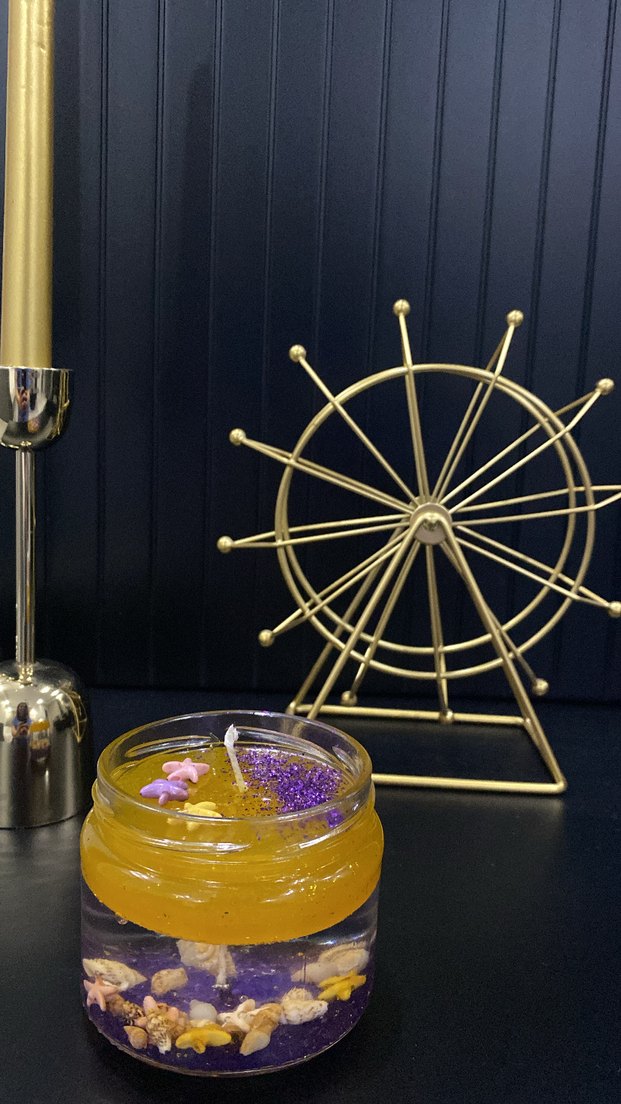 Koyu altın renkli dekoratif mumluk ve içinde çiçek detaylı cam mum, sıcak bir ortam yaratır. Mum, şeffaf kavanozda mor ve sarı katmanlı.
