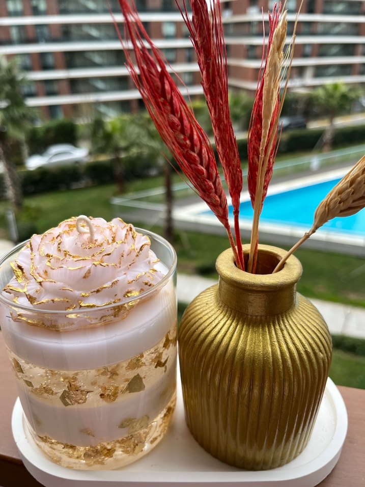 Altın yapraklı dekoratif mum ve kurutulmuş çiçeklerle dolu kabartmalı altın vazo, beyaz tepside yer alıyor. Mumun üstü çiçek şeklinde. ️Altın yaprak varak ile yapılmış olan yanlız mum 350 tldir .Set olarak 500 tldır.