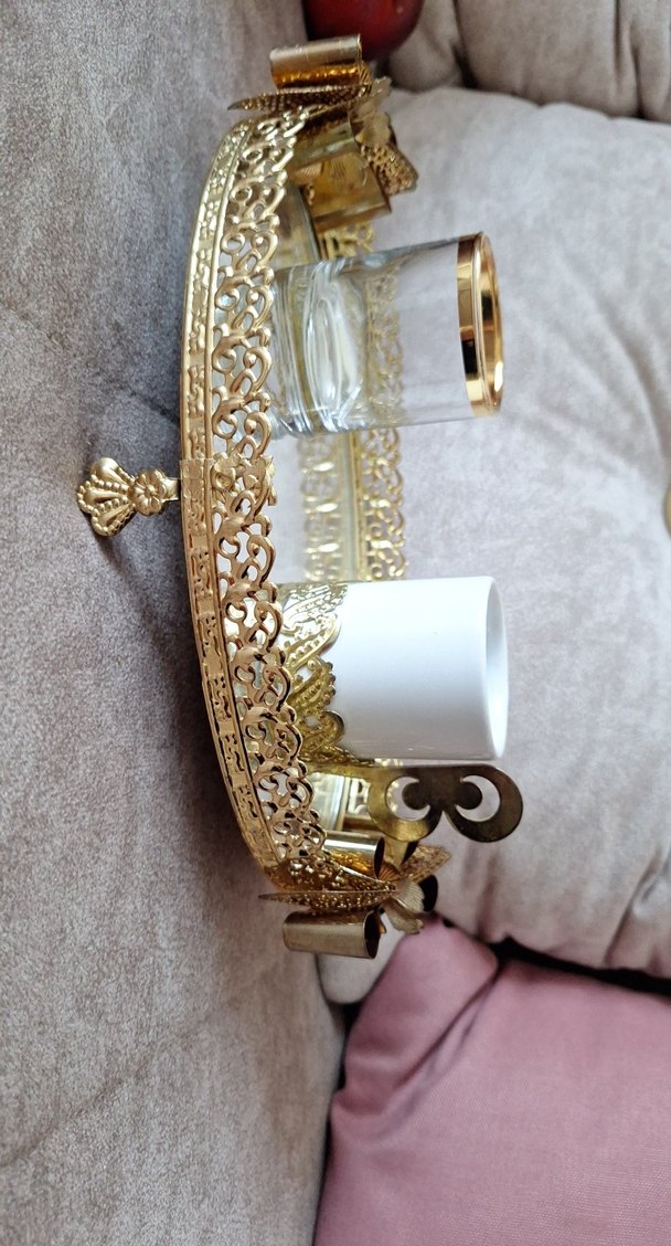 Altın renkli metal çerçeve ve detaylı kesim desenlere sahip dekoratif mumluk seti, iki altın kenarlı cam tutucu ve beyaz mum içerir. ️
