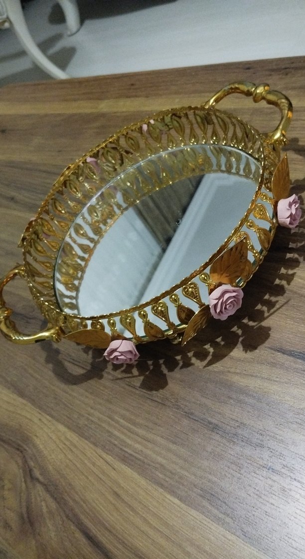 Altın renkli, detaylı desenlere sahip dekoratif sepet. Pembe gül ve yaprak süslemeleri bulunur, şık ve yansıtıcı tabanlıdır.