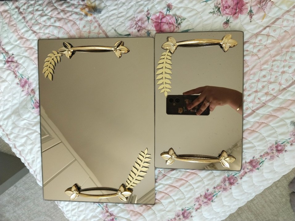 Şık yaprak ve çiçek detaylarına sahip altın renkli dekoratif tepsi, mekana zarif bir dokunuş katar. İsteme Tepsisi olarak kullandım ben isteyene fincanlarını da satarım
