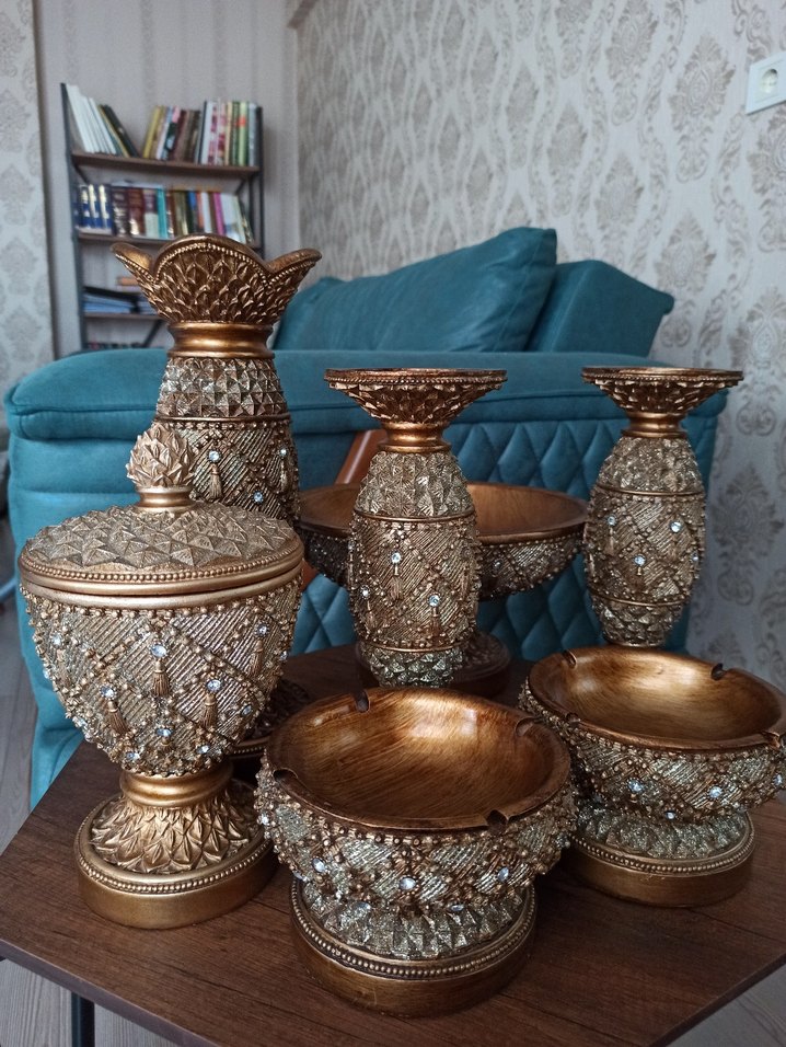 Altın Renkli Dekoratif Vazo ve Kase Seti