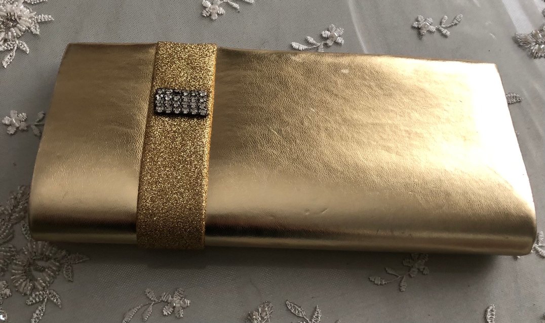 Sıfır üründür…Uzun zinciri vardır…Altın renkli deri portföy çanta, parlak ve payetli detaylı. Düğün ve özel günler için şık ve çağdaş tasarım. ✨Çantanın arka tarafında bir kaç tane küçük ezilme olmuş.. Resmini koydum..Aynı gün gönderilir..