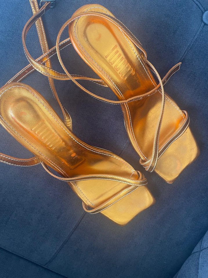 Parlak altın deri malzemeden, tokalı ve ince topuklu kadın sandaletleri, romantik akşamlar için uygun. ✨