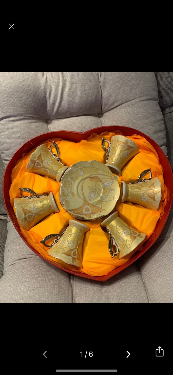 Altın renkli, zarif çiçek desenli altı kahve fincanı ve tabağı, turuncu astarlı kalp şeklinde kutuda sunulmuştur. ☕
