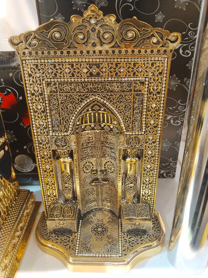 Altın renkli, detaylı süslemelere sahip dini kitaplık, kutsal kitaplar için uygun bir sergileme alanı. mihrap 25 cm ebatlarında ürün sıfır olup kendi kutusunda gelir