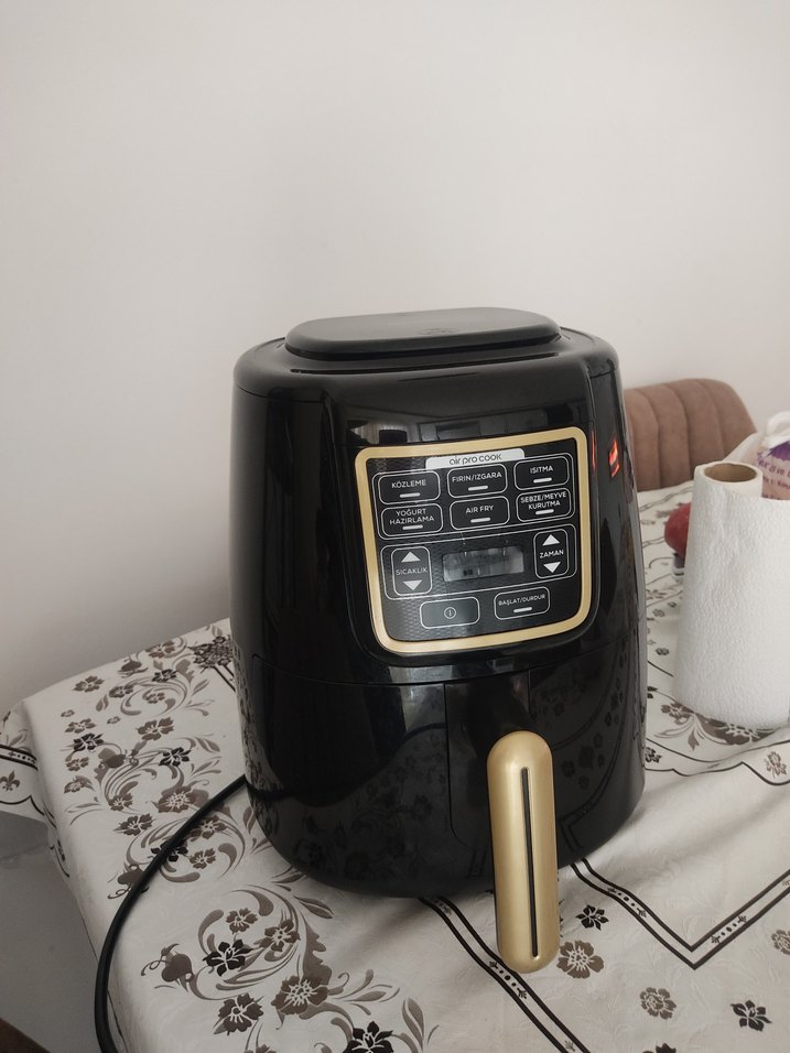Altın renkli dijital kontrol paneline sahip koyu renkli havalı fritöz. Kompakt tasarımıyla mutfak tezgahına uygundur. çok iyi durumdadir