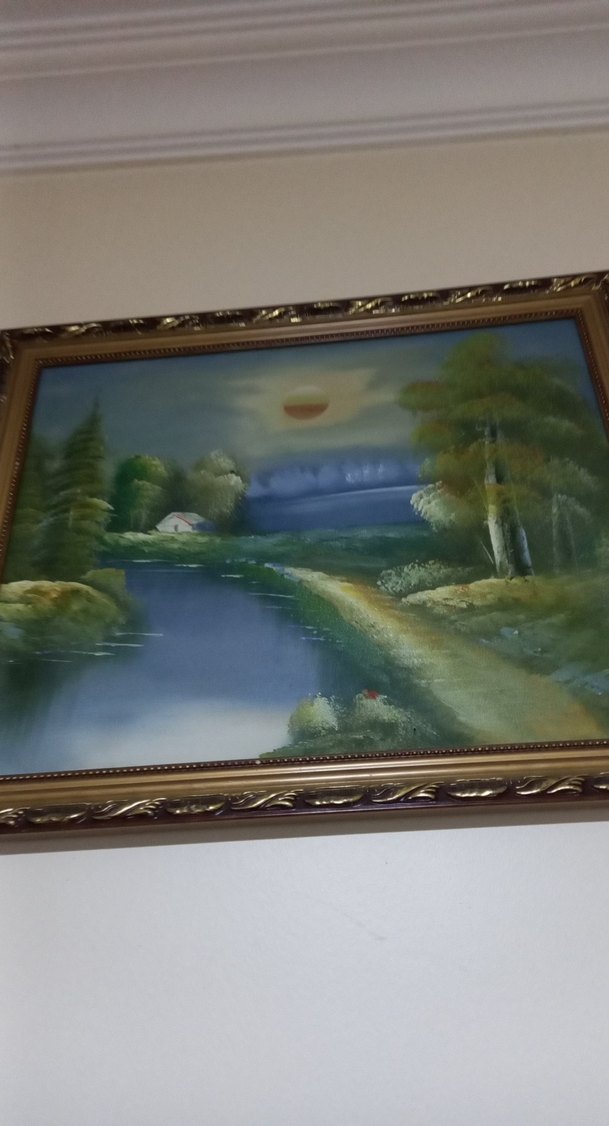 Altın renkli çerçevede, nehir, ağaçlar ve batan güneşi içeren huzurlu bir doğa manzarası tablosu.