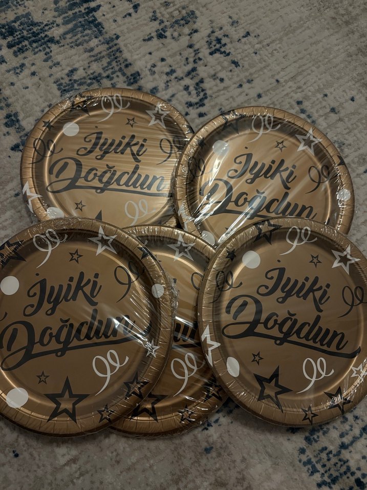 Ürünler paketli ve hiç kullanılmamıştır 50 adet tabak Gold balon 5 adet Şeffaf balon 10 adet Balon standı