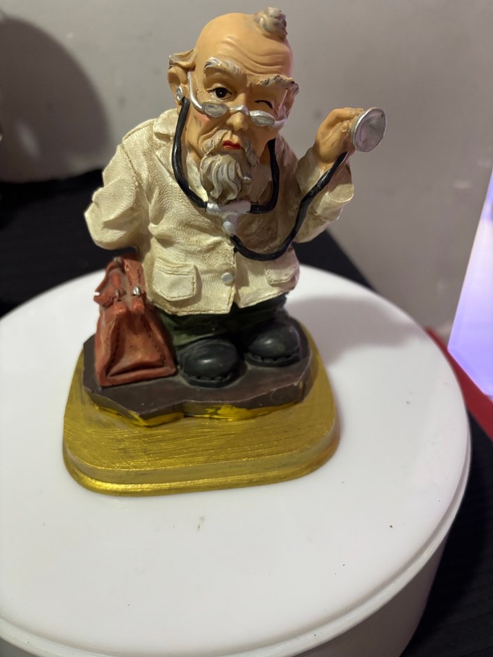 Altın renkli kaidede duran, stetoskop tutan krem renkli doktor figürü. Detaylı ve karakteristik tasarım.
