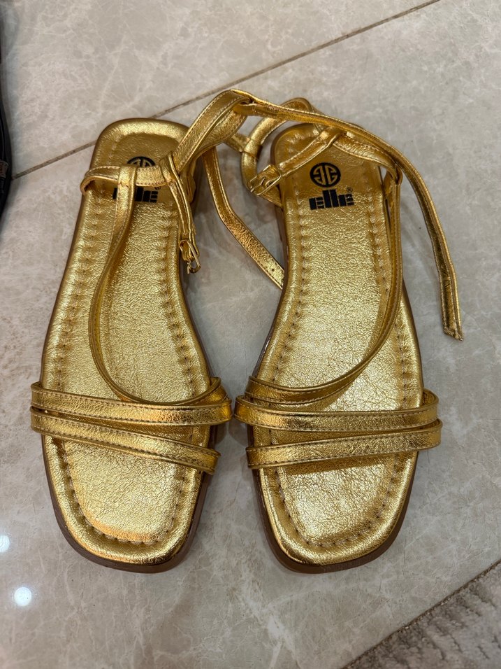Altın renkli, dolgu topuklu ve tokalı kadın sandaletleri. Parlak kauçuk malzemeden, minimalist tarzda günlük sokak giyimi için uygundur. ✨