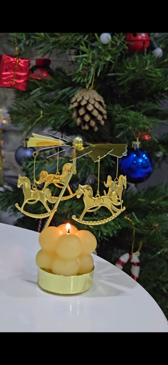 Altın renkli, sallanan at figürlü dönen atlı karınca mumluk. Köpük şeklinde yanar halde mum içerir.