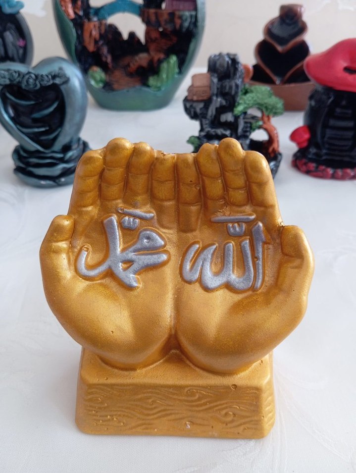 Altın renkli, dua pozisyonunda eller figürü. Üzerinde Arapça yazı ve tabanda dokulu desen bulunur.