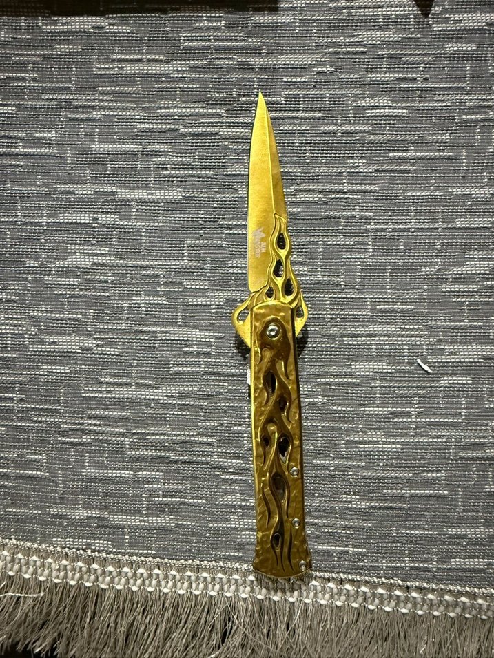 -- sarı renk -- kemer klipsli -- yarı otomatik -- içten kapatma -- oyma dekor EFSANE ALN MASTER MODELİ Koyu altın renginde, sap ve bıçağında karmaşık oyma desenlere sahip dekoratif katlanabilir bıçak.