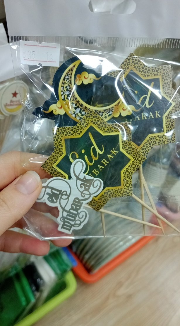 Renkli altın tonlarında hilal ve yıldız figürlü Eid Mubarak parti süsleri, üzerinde 'RAK' yazısı bulunur.